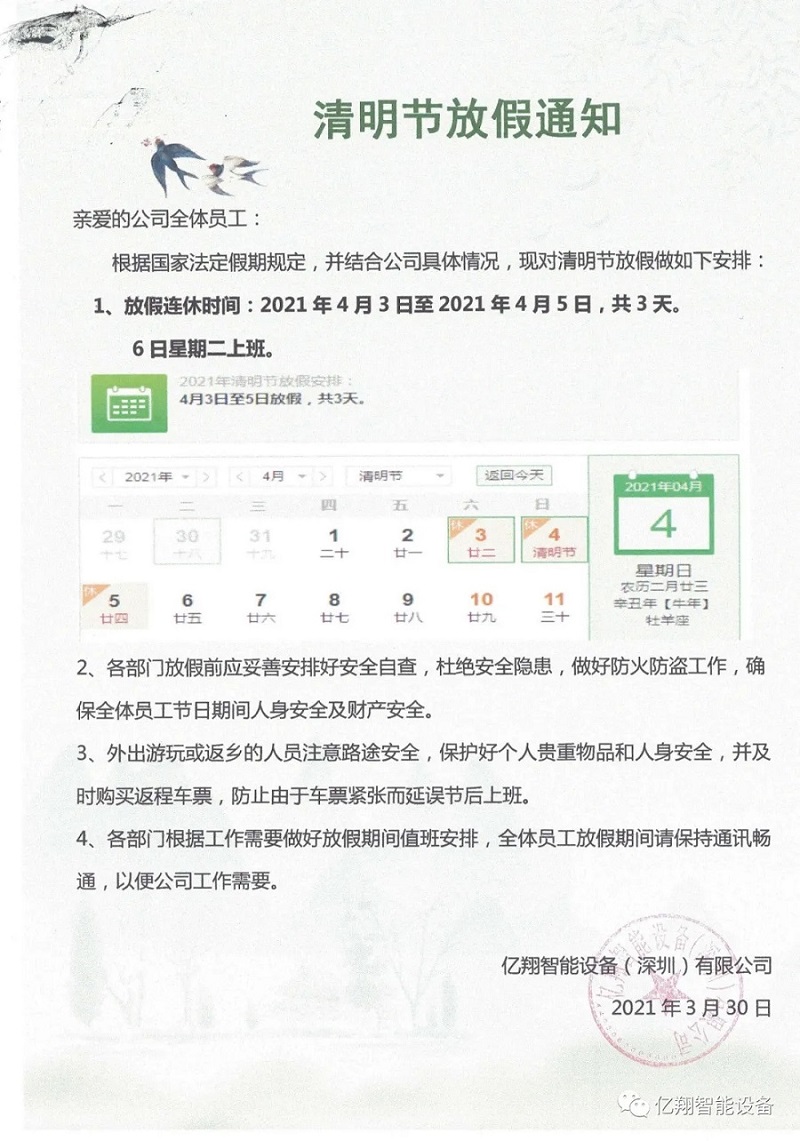 億翔放假通知|溫馨小提示 清明祭祀需防范
